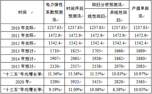 根据上述结果,将各种预测结果数据汇总计算后得出蒙西地区“十二五”全社会用电量预测方案见下表。