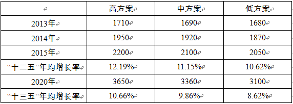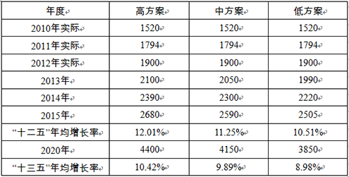 推荐采用中方案,到2015年全社会用电量达到2100亿kWh,到2020年会社会用电量将达到3360亿kWh。