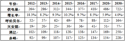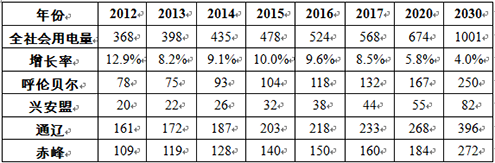 2012~2017年,蒙东地区面临较好的国内外发展环境,经济将持续快速增长,全社会用电量也将明显上升。近期蒙东地区定位为:国家新型能源重化工业、有色金属开采冶炼加工业和绿色农畜产品生产加工业基地;东北亚地区重要的交通枢纽和物流集散地。蒙东地区将依据其战略定位、自然资源、区位条件和优惠政策,规划建设一批具有地区特色的大型工业项目,如呼伦贝尔的煤化工和矿产产业、通辽的霍林河铝厂矿区和奈曼工业园区、兴安盟的经济技术开发区和哈日诺尔煤化工园区、赤峰的经济技术开发区和工业园区。