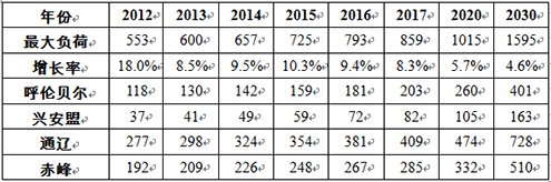 蒙东及各盟市供电最大负荷预测 单位:万千瓦