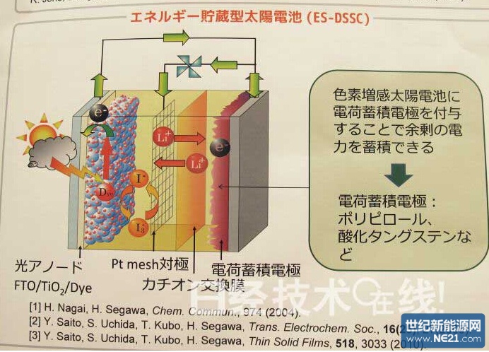 这些展品用到了濑川研究室以前开发的储能型染料敏化太阳能电池“ES-DSSC(energy-storable dye-sensitized solar cells)”的技术,是与索尼合作试制的。ES-DSSC是濑川研究室从2003年左右开始研究的太阳能电池,最初的设计方案是在染料敏化太阳能电池(DSSC)的背面层叠二次电池,DSSC的电极(异性极)和电解液都与二次电池共享。