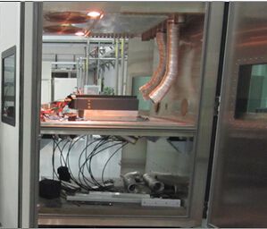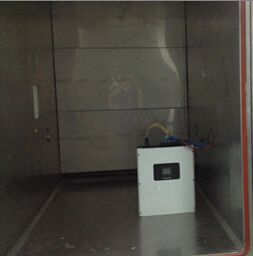 淋雨试验在一个大的温湿度箱进行的,有专门设备控制喷淋的大小和方向,逆变器在70℃/95%温湿度工作一段时长后,对逆变器外壳喷淋凉水。实验前在逆变器内部单板、外壳内侧壁、关键器件、散热器等关键部位贴湿敏试纸,对比试验前后试纸颜色变化,来判断是否有凝露发生。整个试验过程中,逆变器带电运行,实时远程监控运行状态。