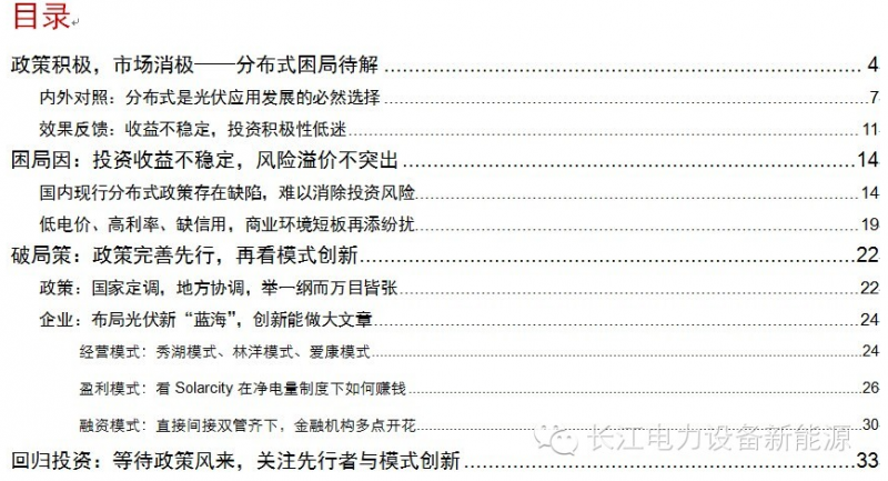 对于分布式,政策面临发展分布式还是大型电站的路径选择,企业则是在投资与不投资的选择后,进行分布式与大型电站的选择,因此打破分布式困局,需要政策先行、企业模式创新跟进。(1)政策方面,余量上网实行标杆电价、提高度电补贴、就近消纳等均是可能、可行的改善措施,地方补贴政策的跟进则是另一重要手段。(2)企业方面,可以通过适当的商业模式创新,规避投资不确定性,提高电站收益,如经营模式创新(秀湖模式、林洋模式、爱康模式)、融资模式创新(如引入信托、租赁资金,众筹模式等)、盈利模式创新,如Solarcity的合资模式(可设计权益转折点,增加银行等资金参与兴趣)、售后回租模式(类BT)、转租赁(可将电站转租电网等大型公司,转嫁风险)等。
