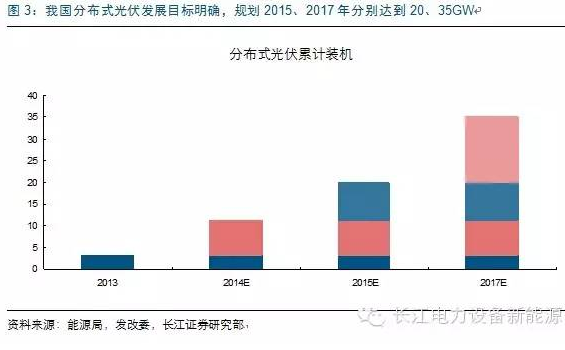 自2014年开始,我国确立分布式为国内光伏主要应用方向,短期、中期目标清晰,规模庞大。1月17日,能源局发布《关于下达2014年光伏发电年度新增建设规模的通知》,指出2014年全国光伏备案目标为14GW,其中分布式8GW,大型电站6GW;3月24日,发改委出台《能源行业加强大气污染防治工作方案》,进一步指出分布式中期目标:2015年达到20GW,2017年达到35GW。为支持国内分布式光伏的发展,发改委、能源局、国家电网、税务总局等部门相继出台多项分布式光伏细则,完善分布式相关政策制度。