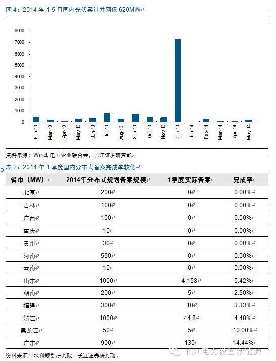 政策如此积极,但是市场对分布式的反映却非常平淡。从电力企业联合会发布的国内光伏并网数据来看,2014年1-5月国内光伏累计并网仅620MW,其中分布式规模更低,发展缓慢;而我们判断上半年全国光伏实际装机约为3GW,其中分布式屈指可数。