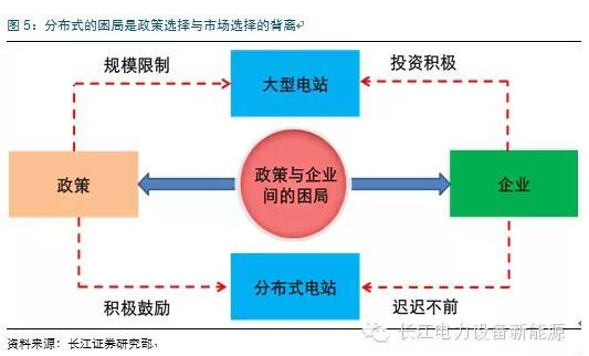 整体而言,政策与市场的背离造成了当前国内分布式的困局,政策虽然积极推动,市场却反应平淡;而政策实行严格规模控制的大型电站市场,争夺激烈。为什么政策要选择分布式而非大型电站?企业又为何不愿参与分布式投资?我们认为政策选择分布式是在发展光伏前提下的政策效应最大化的选择,而企业对分布式投资的迟疑不前则是基于对分布式项目较高不确定性的风险规避。