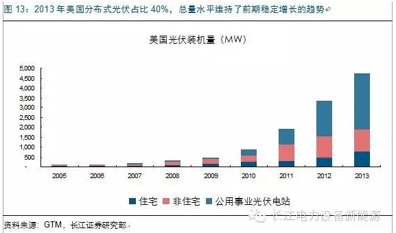 (1)首先,欧盟市场方面,根据EPIA数据,2013年欧洲地区光伏装机中大型电站占比为34%,工业屋顶项目占比为17%,商业屋顶项目占比为27%,居民屋顶项目占比为22%。