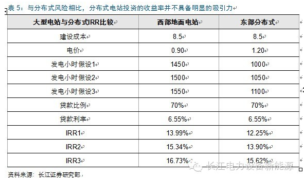 运营商投资面临较大的不确定性,而相对大型电站,分布式又缺少足够的超额收益来弥补这一风险。我们在假设建设成本、贷款比例、贷款利率等变量一致的情况下进行测算,假设分布式发电100%自用,电价为1.20元的情况下,与典型西部地面电站相比,分布式收益缺少明显吸引力。