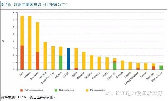 FIT在2000年由德国率先提出并推广应用,带动了德国光伏装机的快速增长,此后西班牙、意大利等欧洲国家光伏行业均实行FIT模式,虽然近年来部分高电价欧盟国家开始采用部分“自发自用”,但FIT依然是欧盟光伏补贴主要模式。从2013年欧盟28国光伏发电在总电力需求的贡献比重来看,主要国家光伏发电以FIT上网为主,意大利、德国等国家存在部分自发自用。