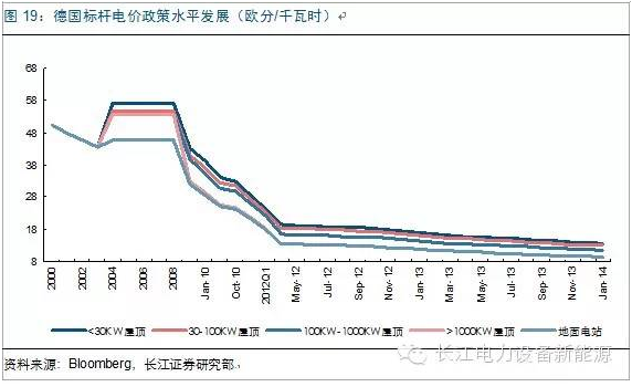具体来看,德国标杆电价将光伏电站分为屋顶和地面电站两大类,屋顶项目再分为<30KW、30-100KW、100-1000KW、1000KW以上四类(后改为40KW划分),分别给予不同水平的标杆电价,项目规模越小,标杆电价水平越高。