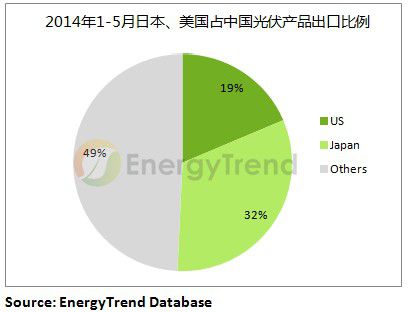 首先看今年1-5月份中国组件厂商的出口情况:2014年1-5月中国的组件出口总量9.7GW,其中出口美国1.8GW,占比18.6%,仅次于日本,成为中国厂商的第二大光伏市场,并保持逐月上升的趋势。出口美国的前四厂商分别是天合、阿特斯、晶科、英利。在美国的反倾销初判之后,天合、阿特斯、英利纷纷发表声明,对美国商务部此举表示反对,认为该举措有悖自由与公平贸易原则,同时异口同声表示不会放弃美国市场,将继续服务美国的客户和贸易合作伙伴。