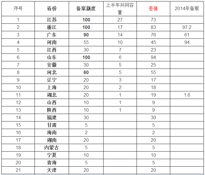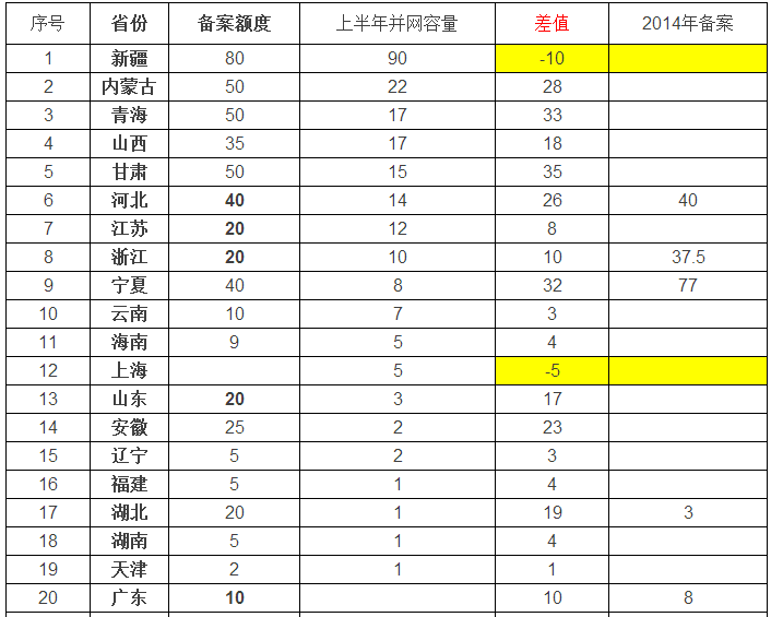 新疆的容量已经超过配额容量。内蒙古、青海下半年肯定会迎来建设高峰期。另外,地面电站容量差距较大的甘肃、河北、宁夏、山西、陕西也应该是建设热点!