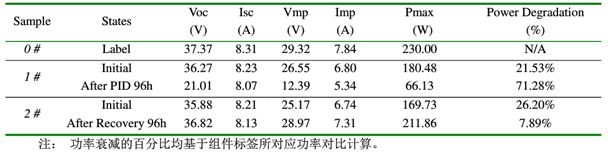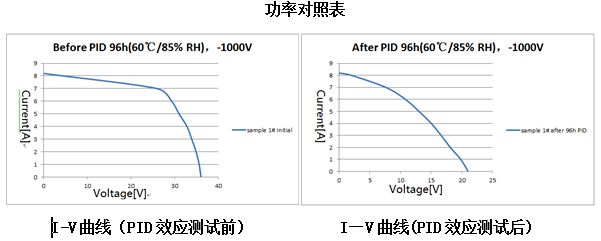 下表为组件PID效应测试前后的参数及I-V曲线对比【1】,通过对比明显可以看出PID效应对太阳能电池组件的输出功率影响巨大,是光伏电站发电量的“恐怖杀手”。