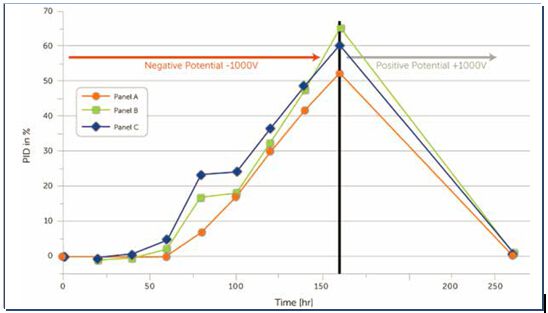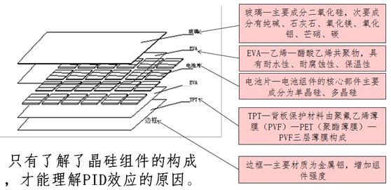 通过光伏电池组件厂商和研究机构的数据表明,PID效应与组件构成、封装材料、所处环境温度、湿度和电压有着紧密的联系。