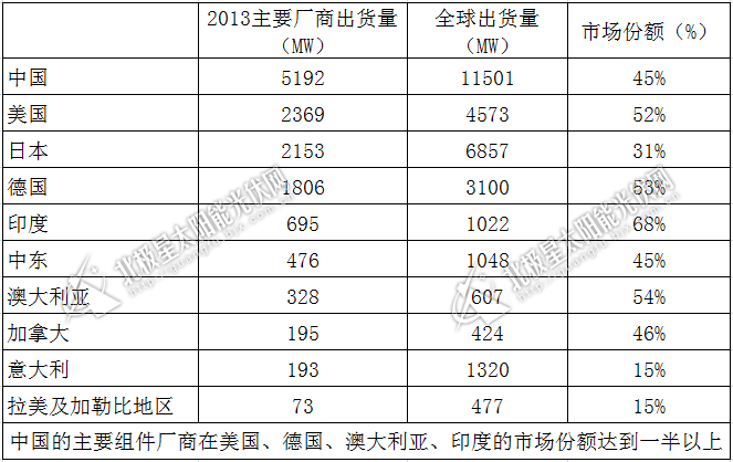 此外,记者还了解到2013年中国、美国、日本、德国、印度、中东、澳大利亚、加拿大、意大利、拉美及加勒比地区主要厂商出货量情况及所占市场份额。其中,2013年中国主要厂商出货量为5192MW,所占比例为全球出货量的45%;美国主要厂商出货量为2369MW,所占市场份额52%;日本主要厂商出货量2153MW,占市场总量的31%;国主要厂商出货1806MW,占据全球出货量的53%。