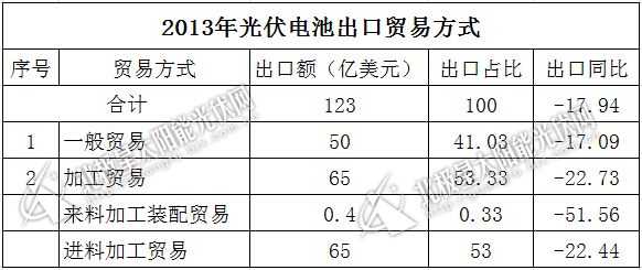 索比光伏网讯:近日,记者从中国机电产品进出口商会获悉,2013年光伏电池出口贸易主要分为一般贸易和加工贸易两种方式,其中一般贸易出口额为123亿美元,加工贸易出口额65亿美元,加工贸易中的来料加工装配贸易出口额仅为0.4亿美元,进料加工贸易则以65亿美元的出口额占据绝对优势。