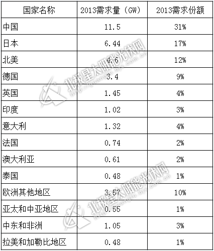 索比光伏网讯:近日,记者从中国机电产品进出口商会获悉,2013年全球光伏需求量为37GW,其中中国11.5GW,占需求份额的31%,日本以6.44GW的需求量位居第二,占据需求份额的17%,北美以4.6亿美元需求排名第三,而曾经的光伏第一大国德国仅以3.4亿美元位列第四,所占份额仅为9%。