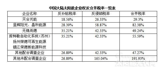 索比光伏网讯:美国商务部于当地时间7月25日公布了“双反”初裁结果,中国大陆和台湾地区被课以重税。从中国大陆销售至美国的相关光伏产品,主要被课征26.33%至58.87%不等的反倾销税;而从台湾销售至美国的相产品则被课以27.59%至44.18%不等的税率。随后,美国商务部还表示将在2014年12月16日公布“双反”终裁结果。