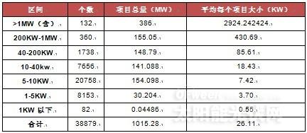 2014上半年德国共有38879个安装项目,总装机量是1015.282MW,平均每个项目的大小约为26.1KW,上半年最大的项目为9999.44KW,最小的项目仅为35W。