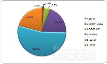 在所有新增项目中,5-10KW,10-40KW,40-200KW,200KW-1MW这四个区间的项目容量大体相当,而超过1MW的项目仅仅只有132个,但是占比超过总安装量的1/3,达到了386MW。目前德国的安装项目多集中在10KW以下。