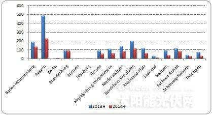 从区域来看,除柏林和不来梅的装机量有所上升外,其余地区装机量均不同程度下滑,最高降幅达66%。2014上半年德国巴伐利亚州(Bayern)虽然与去年上半年相比装机容量削减了53.3%,但依然是装机的主力区域,装机容量达227.5MW。