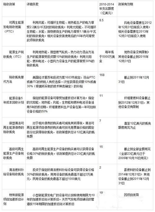 1992年《能源政策法案》中规定给予所有太阳能、地热项目10%的永久性减税优惠政策;2005年《国家能源政策法案》中,美国政府承诺自该法实施之日起至2015年会向全美能源企业提供146亿美元的减税额度。