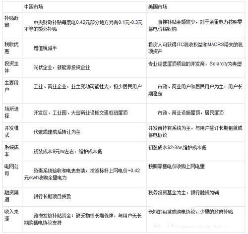 结合中美两国分布式光伏产业扶持政策,以及由此孵化的两国分布式光伏商业模式对比如列示如下表: