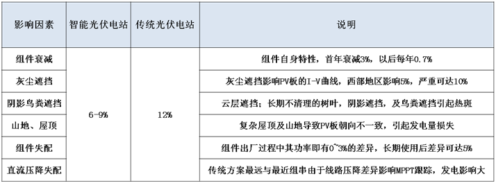 光伏电站中,线路损耗、逆变系统损耗、交流并网损耗相对固定,难以显著改善,光伏阵列损失是主要的改善空间。特别是组件衰减程度不一致的影响。据业界专家研究结果,出厂时,各组件已有不同程度的衰减。电站运行5年后,组件衰减程度不一致性将达到5%以上,严重的甚至达到8-10%。智能光伏电站解决方案通过多路MPPT有效规避了这类损失。下表是智能光伏电站与传统方案在光伏阵列损失维度的比较: