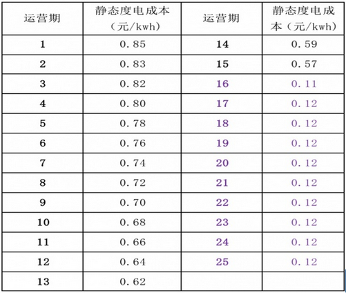 从上面计算可知,在还本付息期(1-15年)里,光伏电站的成本较高,最高达到0.85元/kwh,最低为0.57元/kwh;在完成还贷及折旧计提后,度电成本将降至0.12元/kwh。从静态成本的计算中可以看到,还贷期间光伏发电的成本非常高,而在整个项目的寿命期内却并非如此。因此,通过计算动态成本把光伏发电过程中发生的全部费用在寿命期内进行均摊,有利于更为全面地了解整个运营期内的光伏发电成本。