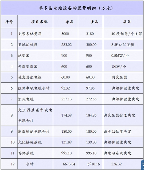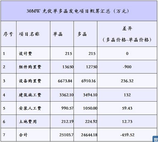 1、265W单晶和250W多晶,单晶组件售价以4.55元/W,多晶组件售价约为4.25元/W,根据30MWp电站EPC合同中各项项目单价算出电站初始投资:采用单晶组件电站投资约为8.37元/W,采用多晶组件电站投资约为8.22元/W;相差0.15元/W。