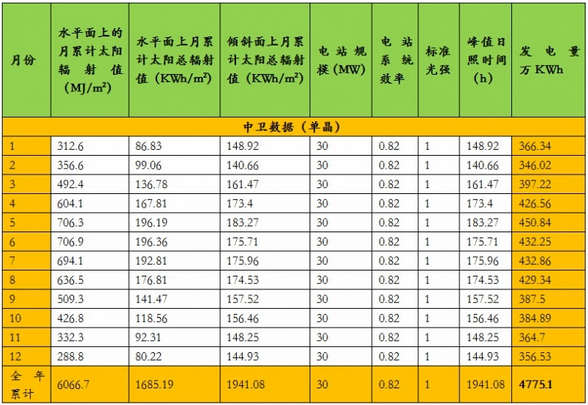 2、根据宁夏中卫地区辐照度条件模拟单多晶第一年发电量:单晶:1.69度/W,多晶:1.59度/W。寿命期内电站寿命期总发电量:单晶38.11度/W,多晶:35.09度/W。