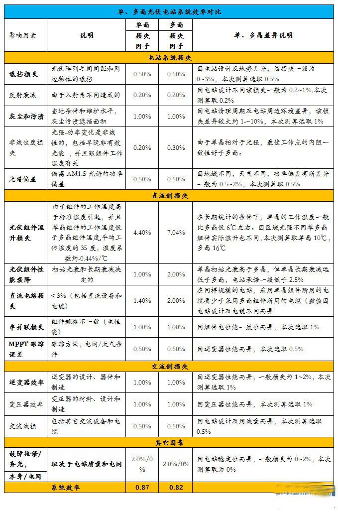 从以上单多晶发电量模拟计算结果两表中可以看出:单晶与多晶电站发电量的差别原因集中体现于电站系统效率上,主要包括: