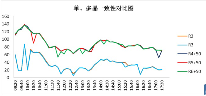 单多晶发电量与太阳辐射值的变化趋势相似。根据最大功率点电子负载的阻值,反应出单晶组件的一致性要比多晶组件的一致性好即非线性损失小于多晶。