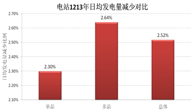 电站衰减实例:上图为宁夏中卫地区同一电站2013年单晶与多晶发电量与2012年发电量衰减情况如右图所示,注:因2012年与2013年实际太阳福照度可能存在差异,故衰减绝对值误差较大,仅具有参考意义,而单晶多晶相对值则体现相同条件下的实际差异(约有0.34%的差异)