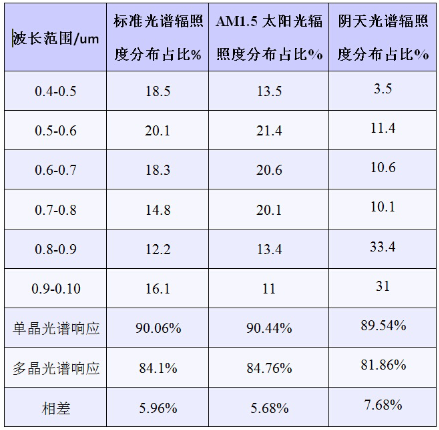 1、标准光源下单多晶光伏响应相差约5.96%与AM1.5太阳光辐照下差距基本一致;