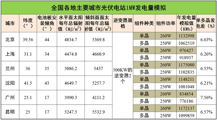 据上分析,我们可得出1MWp单多晶光伏电站在国内各地区发电量差异分析: