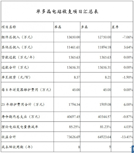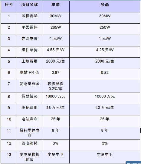 单晶265W组件以4.55元/W,多晶250W组件以4.25元/W)计算结果表明:多晶初始投入比单晶低0.15元/W;