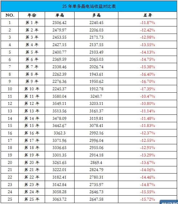 3、寿命期内电站总收益:单晶:24.54元/W,多晶:21.64元/W。单晶收益比多晶高13.41%。