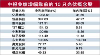 据记者统计,在目前已披露中报业绩的37家公司中,宣告亏损的仅有荣信股份和向日葵这两家公司,分别亏损7656.9万元和2159.2万元。而净利润翻倍增长则有亿晶光电、恒星科技等7家公司,其中亿晶光电凭借大增19.34倍成为整个光伏板块净利润增幅最快的公司。亿晶光电表示,业绩增长主要是因为光伏行业回暖以及公司采取了积极的应对措施。