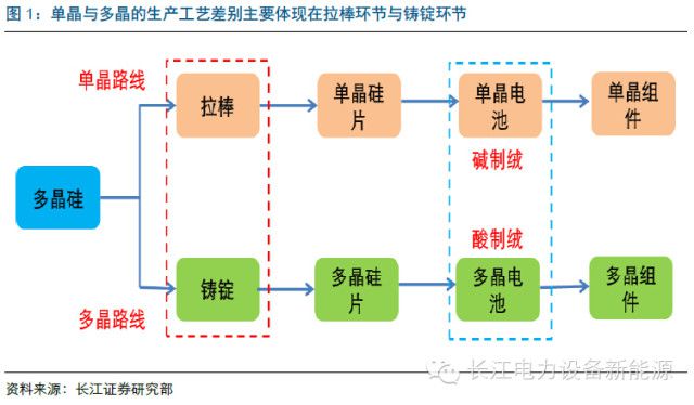 从生产工艺来看,目前,单晶组件与多晶组件的生产差异主要体现在拉棒与铸锭环节,后期的切片、电池(单晶是碱制绒,多晶为酸制绒)、组件环节差别不大。