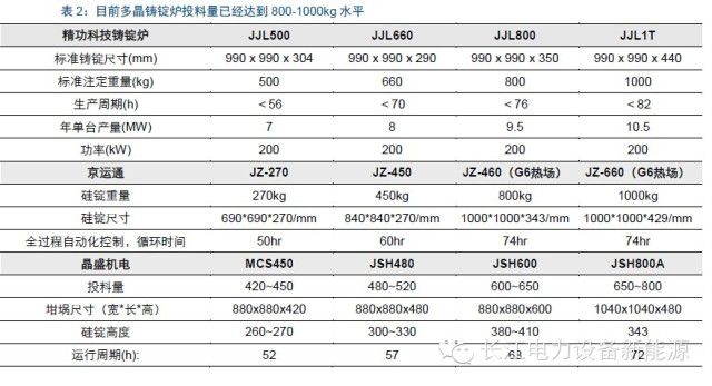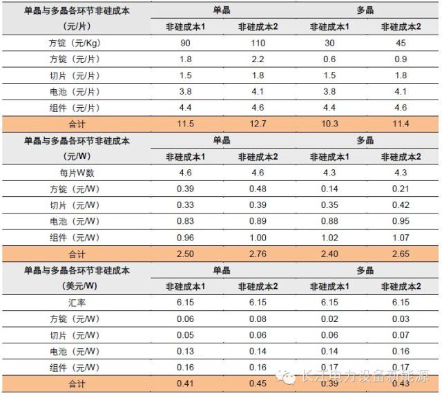 2、目前国内单晶硅棒领先企业非硅成本约90元/kg,多晶铸锭领先企业的非硅成本约35元/kg左右,成本差异主要由单位产出不同造成:生长一炉单晶硅棒与多晶铸锭时间差异不大,但目前单晶单炉投料量仅150kg左右,连续投料可以达到300kg,而多晶单炉投料已经达到800kg,甚至更高的水平;