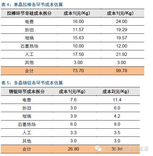 我们根据单晶炉生产工艺参数与多晶炉生产工艺参数简单估算,单晶硅棒每kg的非硅生产成本在75-100元左右,多晶铸锭每kg的非硅生产成本在25-35元左右。当然,通过设备的参数理论上的成本测算低于实际生产过程中的成本水平,据我们了解,目前国内单晶硅棒领先企业非硅成本约90元/kg,多晶铸锭领先企业的非硅成本约35元/kg左右。