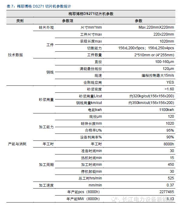 切片方面,我们这里考虑砂浆切割,根据梅耶博格DS271切片机的生产技术参数,以及我们调研数据进行简单估算,目前硅片切割成本在1.56-1.90元/片左右,其中砂浆占比30%左右、钢线占比17%左右、电费占比约15%。
