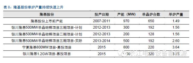 3、单晶硅棒主要通过多种手段提高单位产出,以降低成本:1)提高拉速;2)应用连续投料技术,增加单炉产出;3)缩短非生产时间,如换料时间等。根据隆基股份本次募投项目计算,本次募投项目单炉产量达到3.63MW,相比公司银川隆基三期的单炉2.60MW增加近40%。而多晶投料水平已经逐步接近规模与成本的临界值,在大型热场、坩埚等成本取得突破下降前,单炉投料量进一步做大的区间并不算大。因此,单晶硅棒成本下降空间要大于多晶铸锭。