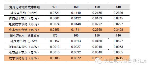 综合来看,薄片化对于硅片成本的影响明显,当硅片厚度由180μm下降至160μm,可节约成本0.17元/片,折合0.037元/W。