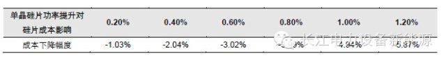 我们假设目前单晶电池转换效率为19.24%,对应电池片功率4.6W,非硅成本3.25元/片,折合0.71元/W。假设效率提高后非硅成本不变,根据我们的测算,当电池转换效率提高0.2%时,单晶硅片单W非硅成本下降1.03%;当转换效率增加1%时,单晶硅片单W非硅成本下降4.94%。