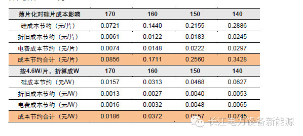 综合来看,薄片化对于硅片成本的影响明显,当硅片厚度由180μm下降至160μm,可节约成本0.17元/片,折合0.037元/W。