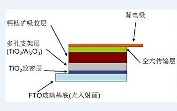 2013年——牛津大学的亨利˙司奈斯(HenrySnaith)将电池中的TiO2用铝材(Al2O3)代替,钙钛矿不仅成为了光的吸收层,也同时是传输电荷的半导体材料。钙钛矿电池的转换效率一下攀升到15%。