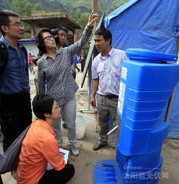 9月4日,中国妇女发展基金会秘书长秦国英(左三)、大众汽车集团(中国)副总裁杨美虹(蹲者)等在观看新近运抵云南鲁甸县江底小学的移动太阳能净水器。近日,由中国妇女发展基金会携手大众集团捐赠的移动式太阳能净水装置运抵云南鲁甸地震灾区。据了解,该净水器由荷兰生产,适用于没有集中供水、供电及缺少安全资源性水源以及供水设备受损的地区和人群,一台净水器日均可为约300至400人提供清洁安全的饮用水。