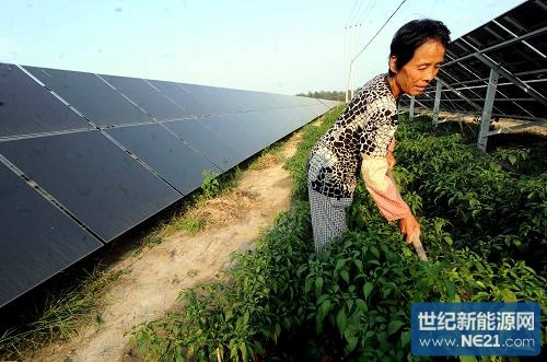 9月9日,在河北永清高科技阳光农业示范区,一位农民在为太阳能光伏电池板下的农作物除草。